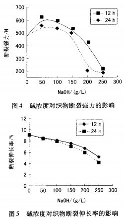 选择NaOH浓度50、100、150、200、250g/L,浸轧(带液率100%)后装入封口塑料袋中,室温25℃下堆置l2或24h。堆置后用温水、冷水漂洗。