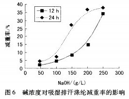 碱冷轧堆精练使吸湿排汗涤纶表面形态受损,必定也会引起织物减量,浓度越高减重率越高(图6)。
