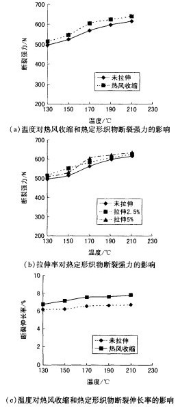 采用间歇式热定形机进行热处理,其中拉伸定形时拉伸比采用2.5%或5%,热风收缩时将要处理的织物无张力放置在导带上,进入热定形机热风处理。热定形温度为130、150、170、190、210℃;热定形时间为60S。