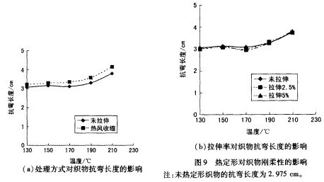 热定型可以改变热塑性纤维的结晶状态和大分子排列的取向度等,由此带来织物刚柔性的变化。抗弯长度越大,柔软度越差。图9反映了定形温度对织物刚柔性的影响。