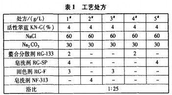 如前所述,活性翠蓝KN.G的母体分子结构比较大,水溶性较差,所以导致扩散性能低,但其在染色初期上染快,易出现盐析现象,使织物产生色花。因而,要解决色花问题,首先要提高染料在纤维中的扩散性能,控制染色初期的上染速率。在染色时必须加入螯合分散剂,以增强染料的扩散性能。