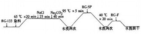 注:要确保化料均匀,料液需过滤后方可加入;控制好染、固色温度;在染、固色2道时,分别加1/2的盐、碱,并充分搅匀后方可开机染色。