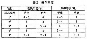 (2)表1中,2#、4#、5#处方所染的布色光艳丽,而1。、3。处方所染的布色光稍有偏黄。原因是固色剂RG—F与纤维素交联键合,在焙烘时发黄所致。