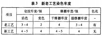 老工艺所需的染化料助剂比新工艺少,成本稍低,工艺流程较短,操作简单,但易产生色花,产品质量不达标。新工艺需加入染化料助剂,成本稍高,工艺流程长,但产品质量好,在~定程度上,减少了活性翠蓝KN—G染色时出现的色花,避免了剥色重染。由于新工艺风险小,故综合考虑较合理。