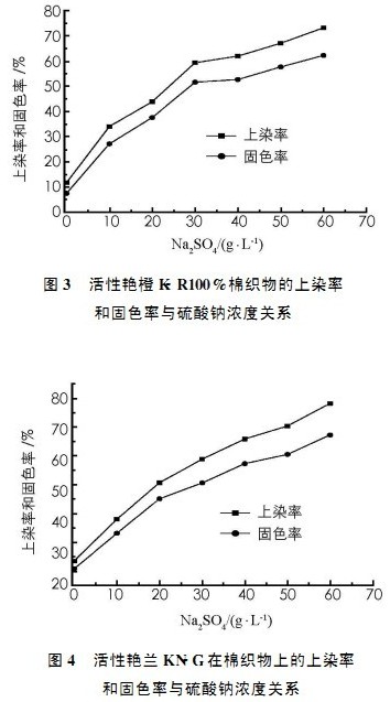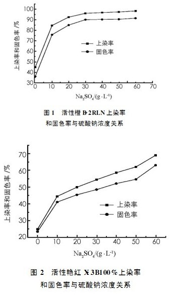 活性艳红X3B100%等其它3支活性染料,上染率和固色率随硫酸钠浓度的升高基本上线性升高,没有出现饱和现象.最终上染率和固色率不及活性橙B2RLN,但固色率都在60%以上,上染直接性还是比较好.