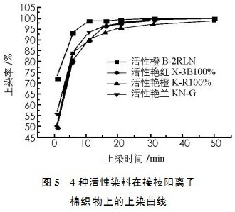 棉织物接枝2,3环氧丙基三甲基氯化铵的接枝增重率为0.67±0.04%.图5是接枝阳离子棉织物用4种活性染料在无盐促染条件下的上染曲线.从图中可以看到,4种染料的上染速率都很快,上染过程在10min内可达90%以上,上染率分别为99.85%,99.89%,98.81%,99.98%.肉眼观察染色残液无色透明,.无残留染料.需要说明的是:在分光光度计上测定染色残液中染料吸光度时,一般用蒸馏水作对照,如果改用在60℃恒温40min的普通棉织物浸