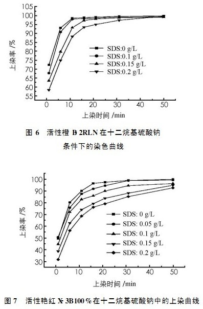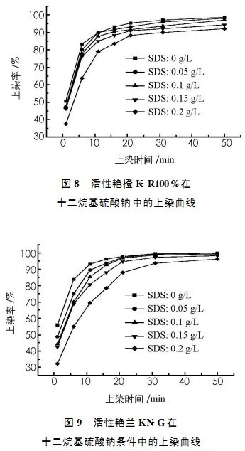 接枝阳离子棉织物活性染料的上染速度非常快,在10min内可达到90%以上,容易引起染色不匀,所以,用十二烷基硫酸钠做缓染剂,研究了阴离子表面活性剂的缓染作用.图6~图9是4支活性染料在不同SDS浓度下的缓染效果。