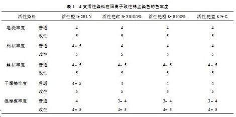 用活性染料染色的普通棉织物在60皂洗条件下,通过表中可以看出其皂洗色牢度为4级.而用活性染料染色的接枝阳离子棉织物,在60℃皂洗条件下,其皂洗牢度都达到5级,皂洗液也观察不到洗脱染料的颜色.从表中可以看出其棉沾和丝沾牢度为4级或4-5级.而用活性染料染色的接枝阳离子棉织物,其棉沾和丝沾牢度都达到5级,皂洗液也观察不到洗脱染料的颜色.另外,可以看出其干摩擦为4级,湿摩擦牢度为3-4级.而用活性染料染色的接枝阳离子棉织物,在进行60次摩擦后,其摩擦牢度都有所提高.