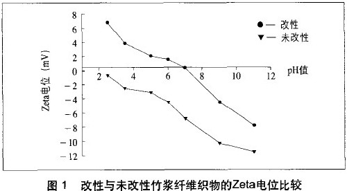 分别取原竹浆纤维织物和RSD改性竹浆纤维织物各 0.5 g,剪成l mm的细小纤维,用0.001 mol/L KC1溶液将纤维配制成0.05% 的溶液,然后调成不同pH值,超声波搅拌 10 min,取少量用JS94H微电泳仪测定其Zeta电位。