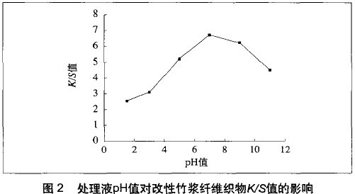 图l显示,在不同pH值水溶液中未改性竹浆纤维的 Zeta电位小于零,而改性竹浆纤维表面Zeta电位大大提升,在pH<7.0时,改性织物Zeta电位为正值,pH>7.0时,Zeta 电位为负值但仍高于同等pH值条件下未改性竹浆纤维表面的Zeta电位。所以改性竹浆织物相比未改性织物能减弱与阴离子染料的斥力,更有利于染料上染。