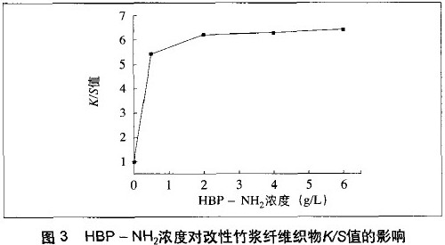 利用不同浓度的HBP—NH2改性液,控~ljpH值为7.0 左右,常温下浸渍处理30 min后,改性织物无盐染色后K/S 值结果如图3所示。由图3看出,随着HBP—NH2 浓度的增加,竹浆纤维织物活性染料无盐染色所得k/s值明显增加。但当HBP—NH2浓度高于2 g/L时,无盐染色所得k/s值增加趋于平缓。所以HBP—NH2浓度选为2 g/L。