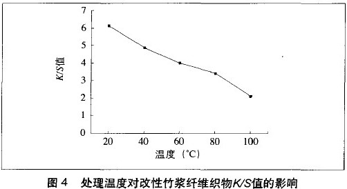 利用2 g/L HBP—NH2溶液在pH = 7.0左右,不同温度下对竹浆纤维织物处理30 min,研究了改性竹浆纤维织物无盐染色K/S值随处理温度变化的关系,结果如图 4所示。在常温下处理,K/S值最高,说明竹浆纤维吸附的 HBP—NH2最多,随着处理温度的升高,染色K/S值不断下降,说明高温并不利于HBP—NH2 的吸附,这是因为竹浆纤维主要依靠氢键、范德