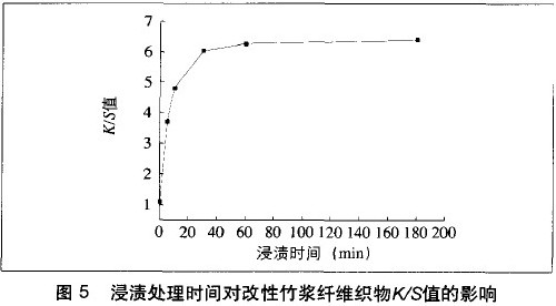 处理时间对改性竹浆纤维织物的影响如图5所示。可以看出,随着浸渍时间的增长,K/S值显著增加,处理30 min后,K/S值变化不再明显,HBP—NH2 吸附达到平衡,因此浸渍处理30 min即可。