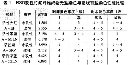 (3)改性竹浆纤维织物采用活性染料无盐染色工艺可以提高K/S值,且染色牢度与常规有盐染色相当。