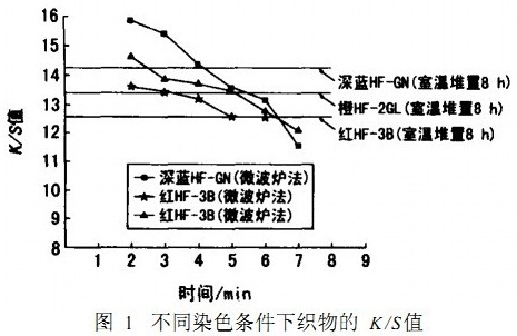 由图1知,活性深蓝HF2GN染色织物经微波炉处理4min左右,其K/S值接近于室温堆置8h的试样;而活性红HF23B需5~6min,橙HF22GL需3~6min。这说明只要采用恰当的处理时间,微波炉法处理试样的表观颜色深度可接近于室温堆置的布样。此外,试样的表观颜色深度随处理时间的变化非常敏感,相差1min,K/S值变化约为1~1.5。
