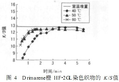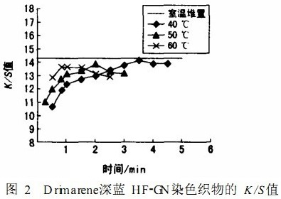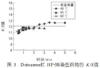 从图2、3、4来看,染色试样在恒温水浴堆置过程中,随着固色时间的延长,其表观颜色深度逐渐接近室温堆置的试样。例如,上述三个染料在40、50和60℃恒温水浴中分别堆置3、1、1h后,其K/S值与室温堆置相差0.5左右。固色基本完成后,随着堆置时间的延长,在一段时间内试样的颜色深度基本趋于稳定,因此时间对K/S值的影响较小,试验易于控制。