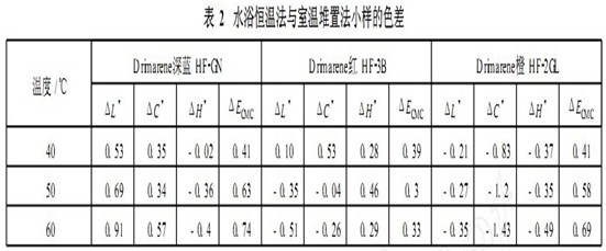 表2中,恒温水浴法试样与室温堆置法试样在亮度、色相上基本一致,色差ΔECMC<0.8,符合要求。考虑到采用40℃恒温堆置需3h,时间较长,认为较为合适的试验条件是:50℃堆置1~2h或60℃堆置1~2h。