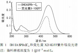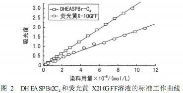 由图1可知,DHeASPBr2C4的最大吸收波长为454nm,比荧光黄X210GFF最大吸收波长(441nm)略大些,溶液呈橙色。测试不同浓度染料溶液的吸光度,作出如图2所示的标准工作曲线。根据朗伯2比尔吸收定律,计算出DHEASPBr2C4和荧光黄X210GFF的摩尔消光系数,分别为32211dm3#cm-1#mol-1和20900dm3#cm-1#mol-1,前者的摩尔消光系数比后者要大些,此结果在图1中也有反映。
