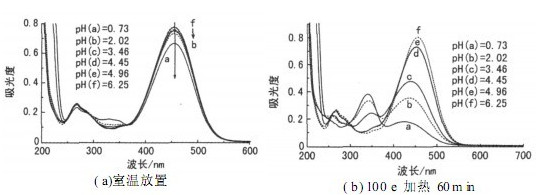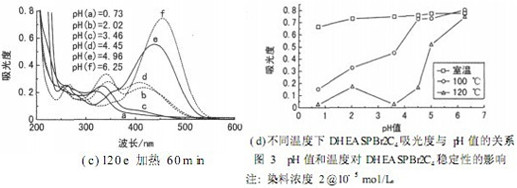 如图3所示,室温下,在pH值2~6.5范围内[图3(a)中,b2f曲线],溶液在最大吸收波长处的吸光度变化不大,pH值的变化对DHEASPBr2C4溶液几乎无影响,只在pH值为0.73时,吸光度有所降低。而100℃加热60min后,吸光度随着pH值的降低逐渐降低,pH值为0.73的溶液在可见区内的吸收峰很不明显。120℃加热60min后溶液变化最大,最大吸收波长处的吸光度降低得比较明显,pH值为0.73和3.46溶液在可见光区内都无吸收峰。产生这一现象的原因,可能与荧光染料分子发生质子化有关。