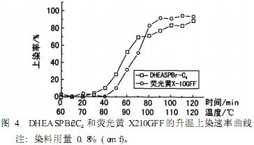 苯乙烯吡啶盐阳离子荧光染料DHEASPBr2C4和荧光黄X210GFF在CDP纤维上的提升性曲线见图7。