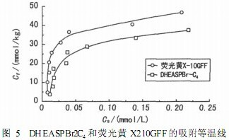 苯乙烯吡啶盐阳离子荧光染料DHEASPBr2C4和荧光黄X210GFF的吸附等温线见图5。
