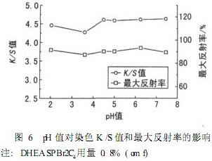 (2)不同pH值的DHEASPBr2C4水溶液在常温下相对较稳定,高温下稳定性降低,其最大吸收波长下的吸光度随pH值的减小而减小,温度越高,pH值对染料的影响越大;提高染浴的pH值,DH℃ASPBr2C4染色纤维的K/S值略有增加,其最大荧光反射率也有所增大。