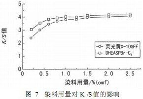 如图7所示,CDP纤维的表观色深值K/S随着染料用量的增加而增加,当用量接近于1.5%(omf)时,几乎达到饱和,大于1.5%(omf)时,表观色深值K/S变化不大,DHEASPBr2C4的提升性略好于荧光黄X210GFF。