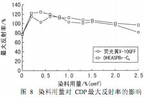染色纤维的最大荧光反射率与染料用量的关系见图8。具有荧光性能的纤维织物其最大荧光反射率一般