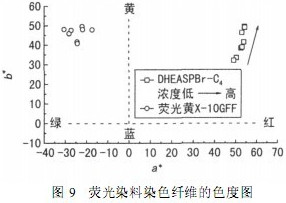 由图9可知,荧光染料DHEASPBr2C4染CDP纤维的颜色特征值a*,b*处于红黄区域,而荧光黄X210GFF处于黄绿区域。DHEASPBr2C4用量的不同对染色CDP纤维的颜色有一定的影响:随着染料用量的增大,饱和度逐渐增大,CDP纤维表现出更重的黄光。