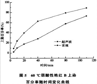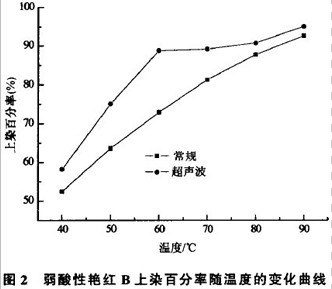 其他温度条件下,超声波作用效果不明显的原因可能是:40~50℃ 时,超声波对染料的增溶解聚作用及对羊毛纤维鳞片层的展开和增塑作用不明显;80~90℃时,染料溶解基本上均匀,羊毛鳞片层也已充分溶胀,超声波的影响就居于次要地位了。