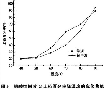① 分析了弱酸性艳红B、弱酸性嫩黄G、弱酸性艳蓝RAW 3种染料的染色上染百分率随温度变化的曲线,得出了超声波染色羊毛的最佳温度为60— 70℃ ,最佳时间60- 90 min。