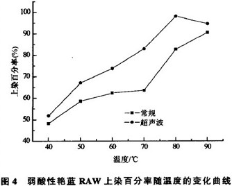 通过对羊毛织物在常规和超声波条件下染色温度的对比,得到了3种染料的上染率百分率随温度的变化曲线,如图2~4所示。