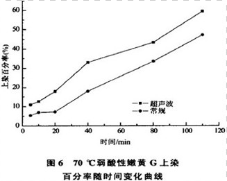 由图可知:同一温度下,超声波条件下染料上染百分率较常规条件下要高;但在不同的温度下,染料上染百分率的提高率是不一样的。如弱酸性艳红B 染料在60℃时提高的程度是最大的,常规条件下的上染百分率是72.88%,超声波条件下的上染百分率达到了88.81%,提高了15.93%;对于弱酸性嫩黄G、弱酸性艳蓝RAW,上染百分率提高最大的均是在70℃。这些数据说明,超声波在提高染料的上染百分率方面确实起到了一定的作用,最佳温度在 70℃左右。超声波可明显降低羊毛染色的温度,这都是由超声波振荡所引起的空穴效应及其分散、增溶、扩散、脱气作用所致。