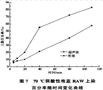 ② 超声波对染色效果的影响有一定的作用范围,在其作用范围内,提高频率有利于染料的上染。