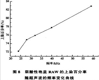用弱酸性艳蓝RAW 70℃时在不同频率超声波的作用下对羊毛织物染色90 min、,得出染料的上染百分率随超声波频率变化的曲线,如图8所示。