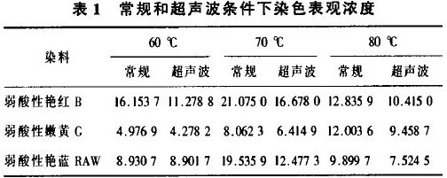 在60、70、80℃时,对常规和超声波条件下的染色布样进行染色表观浓度测试,实验结果见表l。