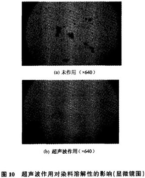 图1O可以清楚地显示出超声波振荡前后染料的溶解情况:振荡前,染料颗粒局部呈现聚集状态,溶解不够充分,粒度也较大;通过超声波的分散和扩散作用,将聚集的染料颗粒击碎,使其粒径变小,对溶解性较低的染料,可明显地提高溶解度,对溶解性较高的染料,达到更好的溶解,振荡后,超声波利用其分散增溶的作用使各种染料的溶解度有了相应的提高。染料溶解度的提高,对于染料更好地上染是有利的,提高了染料的利用率。