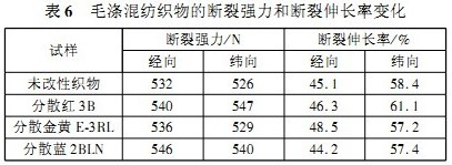 染色后毛涤混纺织物的断裂强力和断裂伸长率,如表6所示。