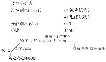 (2)毛涤织物较合适的改性条件:改性剂4%(owf),分散剂0.5g/L,碳酸钠0.05,温度90℃,时间40min,pH值=9。