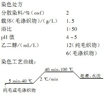 (3)改性毛涤织物较合适的染色条件:染料2%(owf),载体1.5g/l,乙二醇12ml/l,染色温度100℃,染色时间60min。