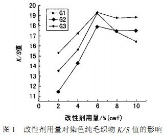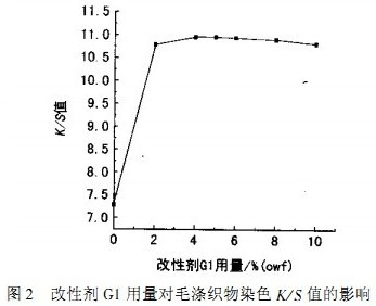 2.1改性剂对纯毛织物分散染料染色K/S值的影响