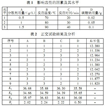 按表1、2设计的四因素三水平进行正交试验,通过测试毛涤织物的染色K/S值,对毛涤织物G1(4%,owf)改性工艺进行优化,分散蓝2BLN用量2%(owf)。