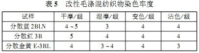 从表5可知,改性后的毛涤织物染色牢度均达到3级或3级以上,说明其与分散染料的结合力增大。