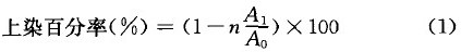 式中,A1 为染后残液稀释a倍后的吸光度;A。为空白染液稀释b倍后的吸光度; n=a/b ,即染后残液稀释倍数与空白染液稀释倍数之比。