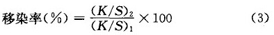 式中,(K/S)1 、(K/S)2分别代表移染后原色布、白织物的K/S值。