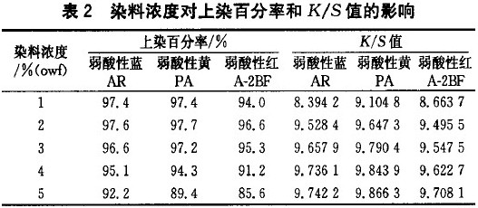 从表2可看出,随着染料浓度的增加,K/S值有增大趋势;但染料浓度达到3%时,K/S值趋于缓和,增加缓慢,染料的上染百分率趋于下降。这说明染料上染织物的染座达到饱和。