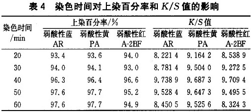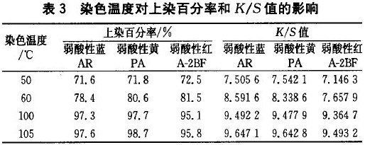 在阴离子型表面活性剂浓度2%(owf ),浴比1:50,用醋酸及醋酸铵调节染浴pH值=5.5,按最终保温温度5o、60、100、 105℃测定上染百分率和K/S值,其结果见表3。