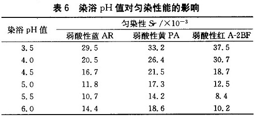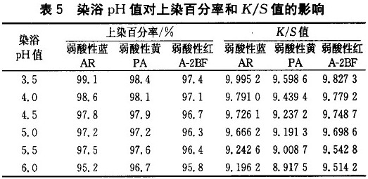 用醋酸及醋酸铵调pH值为3.5、4.O、4.5、5.0、5.5、6.O,测定锦纶超细织物的上染百分率和K/S值,结果如表5、表6所示。