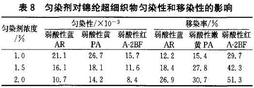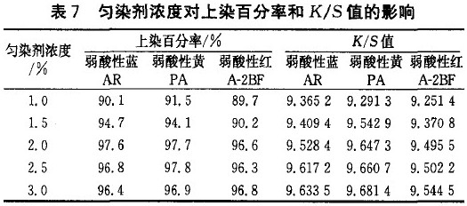 在匀染剂浓度为1.O%、1.5%、2.0% 、2.5% 、3.O %,测定锦纶超细织物的上染百分率和K/S值,结果如表7所示。