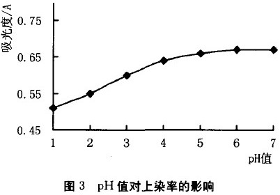 从图3可以看出,pH值对酸性染料在亚麻纤维上的上染率影响较大。pH值较小时,染色残液吸光度小,即上染率较大,随着pH值提高,上染率降低。当pH值在6时,上染率趋于最小。为尽可能避免染液pH值使上染率提高这一因素,更好地考察亚麻表面的酰胺基对上染率的影响,染浴pH值选为6~7。